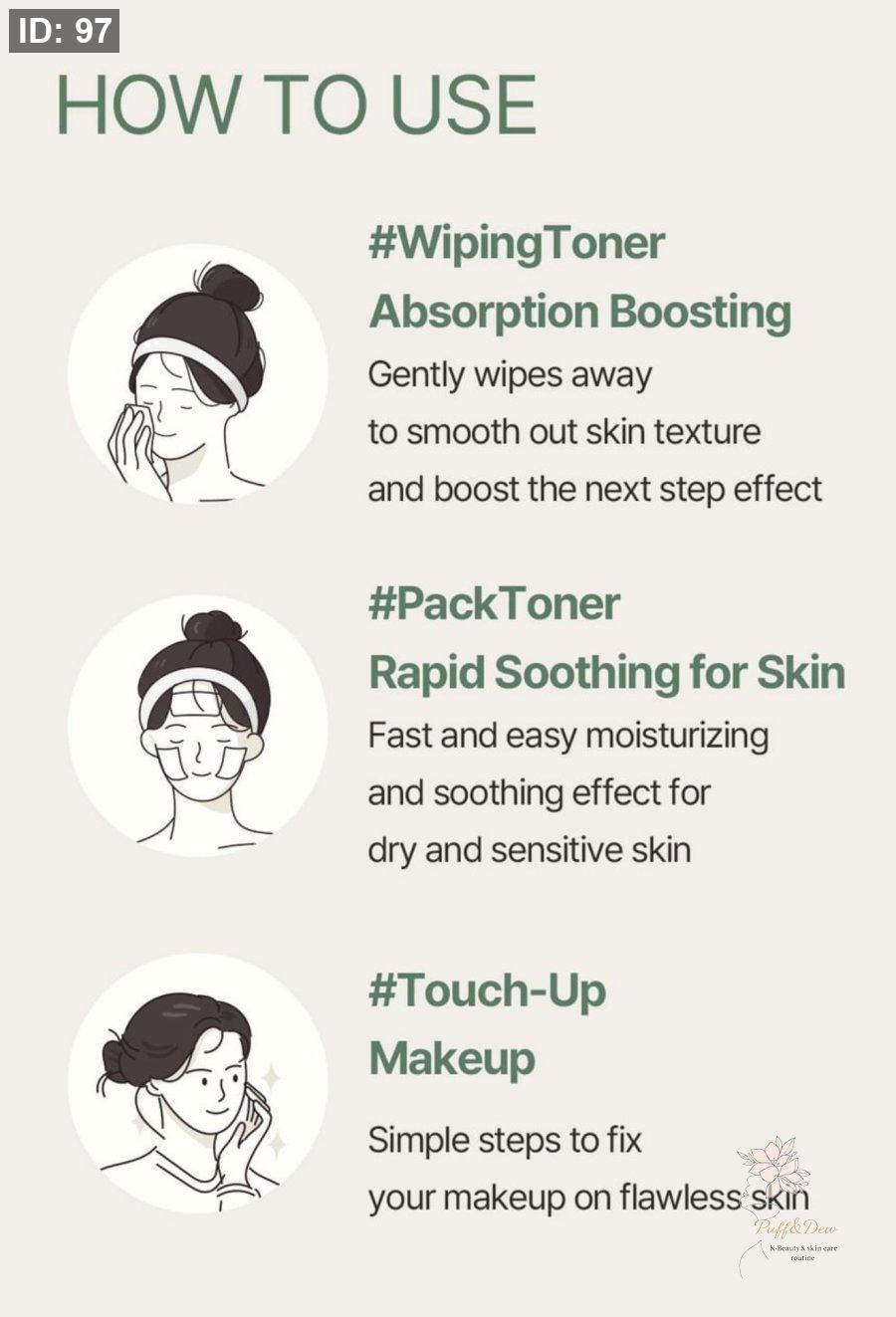 كتونر مسح: امسحي بلطف على البشرة بعد التنظيف لتنعيم ملمسها وتعزيز تأثير منتج العناية التالي.